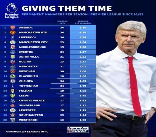 《轉會市場》統(tǒng)計了英超各隊的歷任正式主教練平均執(zhí)教年限情況,阿森納無懸念居首的。