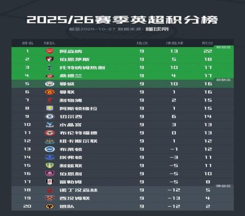 截至2025年10月27日,英超25-26賽季第九輪比賽全部結(jié)束。阿森納以22分高居榜首,與伯恩茅斯、熱刺和桑德蘭組成了新的“爭(zhēng)四集團(tuán)”。而另一端的狼隊(duì)則持續(xù)低迷,開(kāi)季至今僅取得2平7負(fù),積2分墊底。
